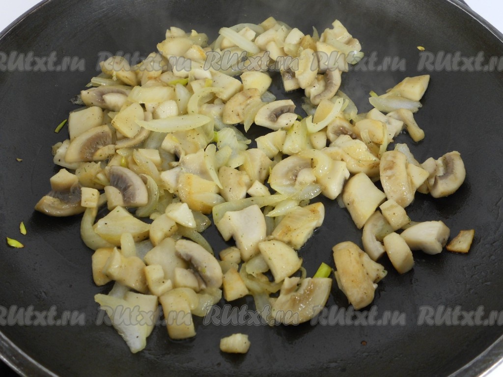 Обжарить шампиньоны (или отваренные лесные грибы) на растительном масле вместе с измельчённым луком на среднем огне в течение 10 минут, не забывая периодически перемешивать.