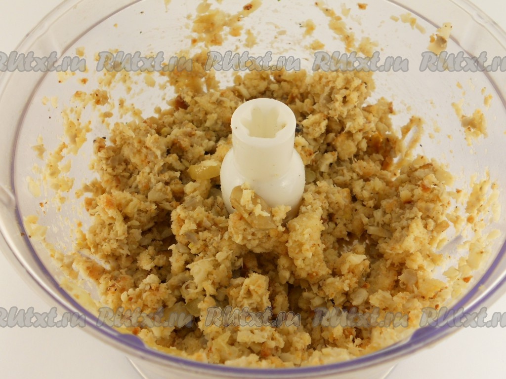 Переложить грибы с луком в чашу для миксера, добавить ломтики батона, измельчить. Можно вместо блендера пропустить хлеб и грибы через мясорубку. Посолить получившуюся грибную начинку по вкусу.