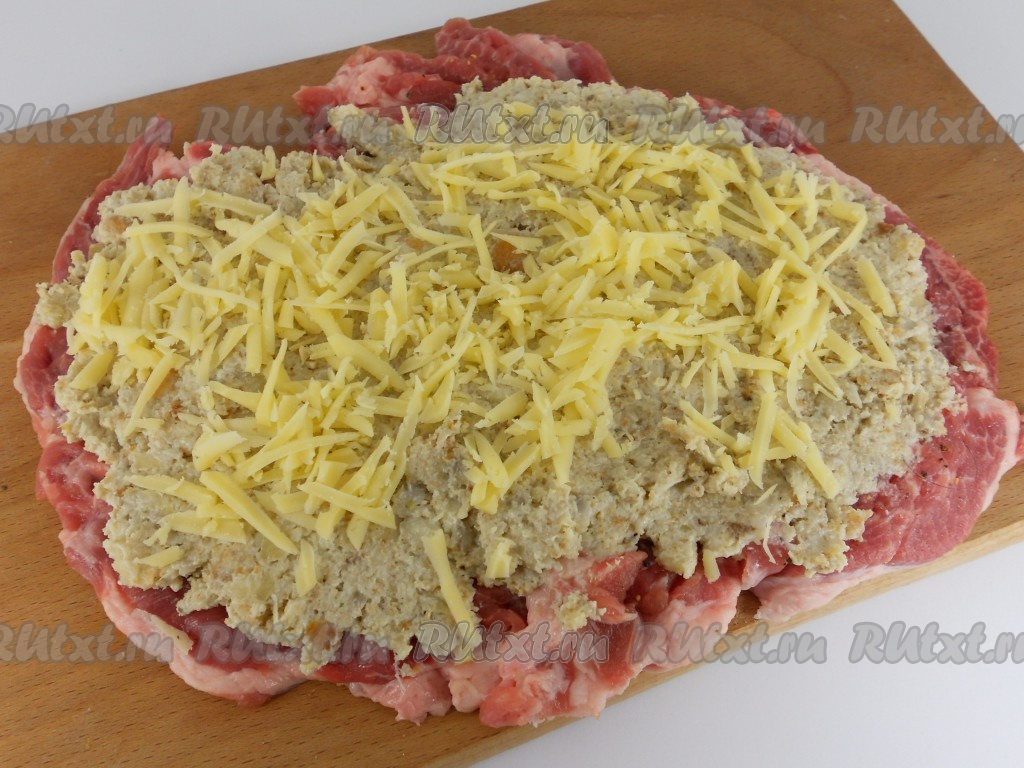 Разложить начинку по всей поверхности отбитого мяса. Сверху посыпать натёртым на тёрке сыром и натёртым на мелкой тёрке чесноком.