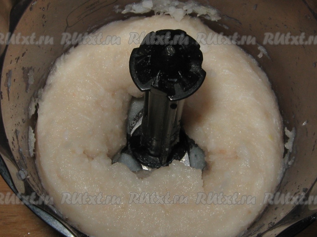 Пробить рыбу с рисом и луком до получения однородного фарша.