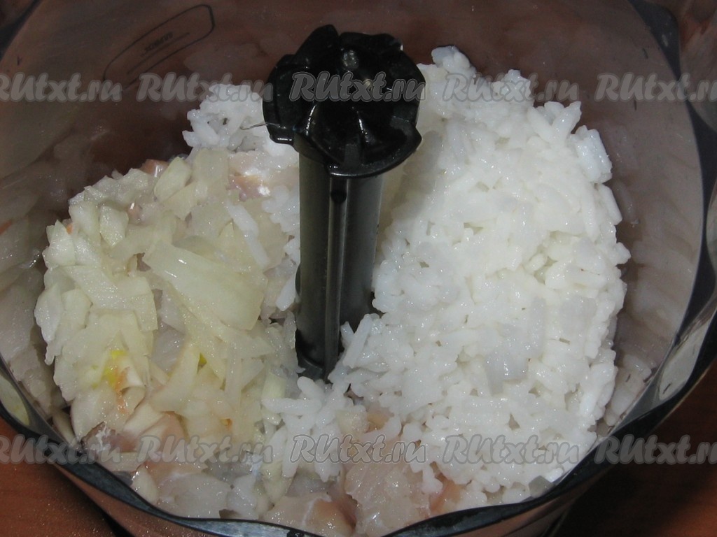 Лук очистить. Филе рыбы, рис и мелко нарезанный лук поместить в измельчитель, посолить. Вместо измельчителя можно использовать мясорубку.