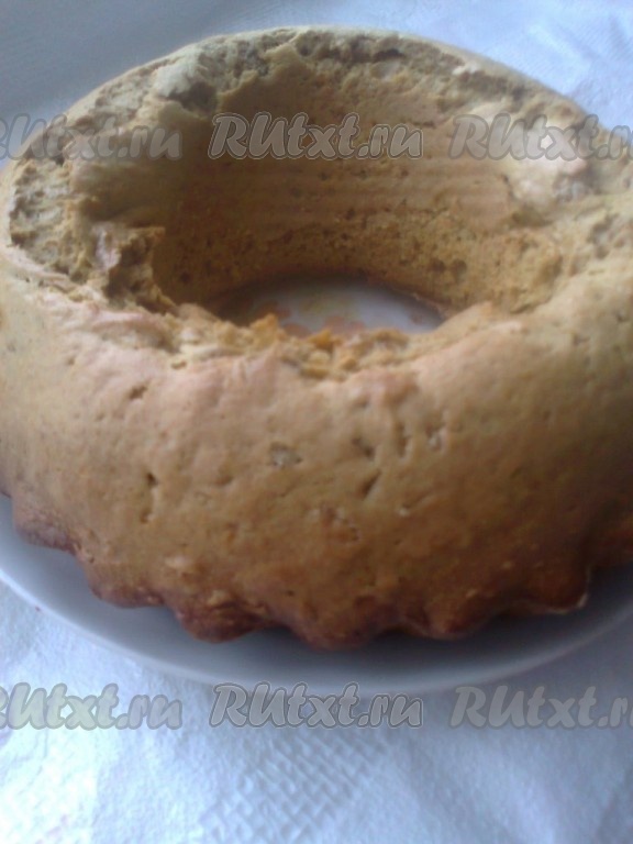 Поставить в духовку. Выпекать при температуре 180 градусов в течение 30-40 минут (готовность проверить сухой деревянной шпажкой (спичкой)). При необходимости (когда верх уже подрумянился, а кекс еще сыроват) верх кекса прикрыть листом фольги или бумаги для выпечки и допекать до готовности. Готовый кекс немного остудить. Остывший кекс извлечь из формы и полить глазурью.