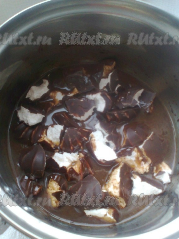 Приготовление глазури. Растопим в небольшой кастрюльке сливочное масло, добавим сахар, молоко, какао и порезанный кусочками зефир в шоколаде.
