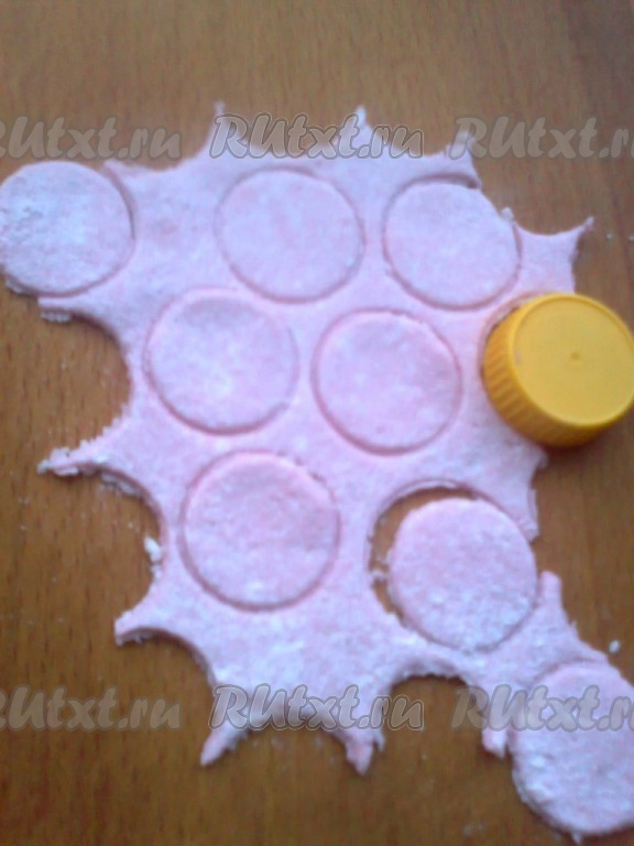 Подсыпать на стол еще 0,5 стакана сахарной пудры, раскатать оставшееся тесто толщиной 1-2 мм. Вырезать крышкой от минеральной воды кружочки. Края кружков утончаем, можно размять пальцами или раскатать краем рюмки (можно оставить как есть).
