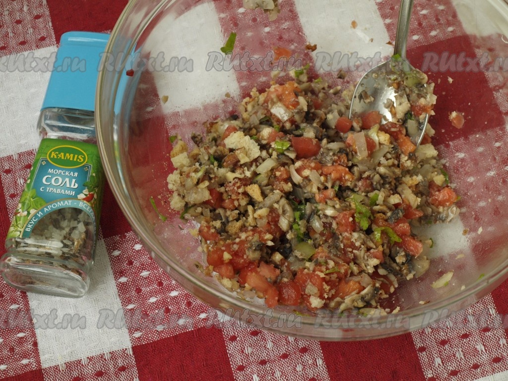 Вынимаем шляпки шампиньонов из маринада. Для приготовления начинки к оставшемуся маринаду добавляем лук с грибами, орехи, помидоры, крошки сухариков, всё перемешиваем и солим. Полученной массой фаршируем шляпки шампиньонов.