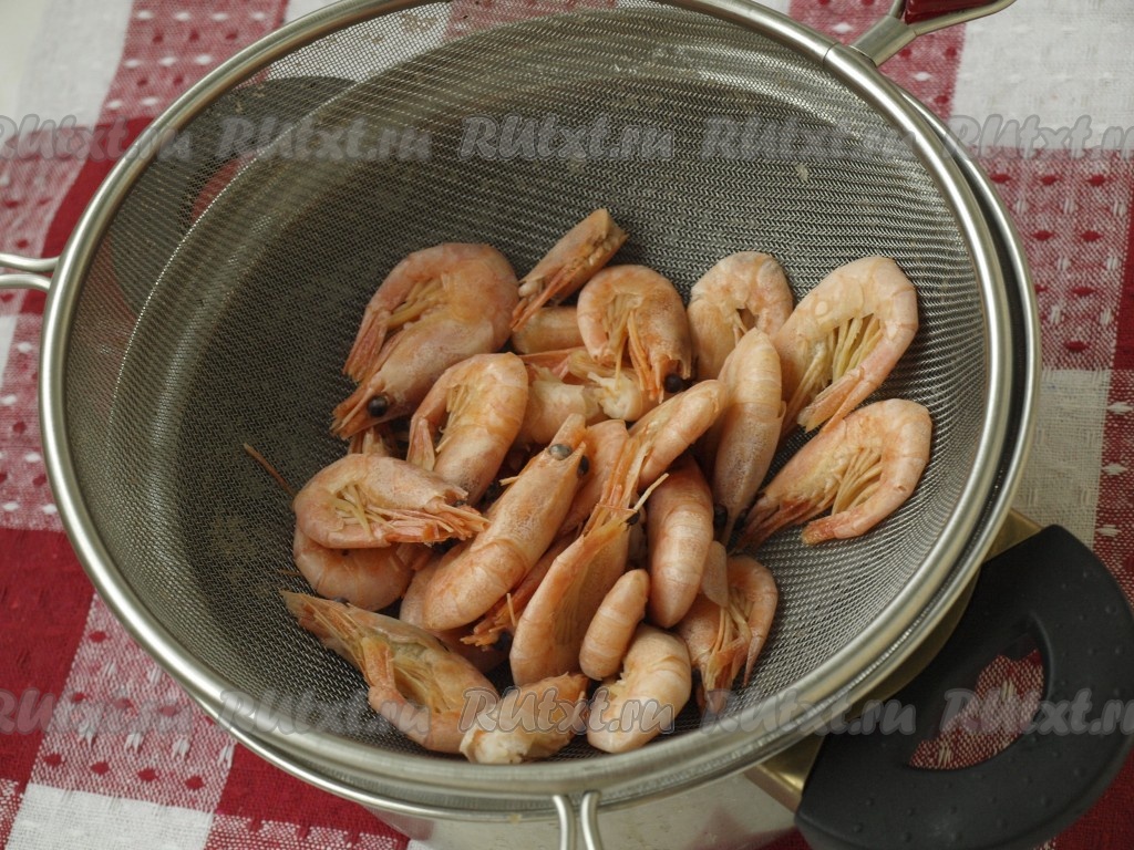 Креветки опускаем на 1 минуту в кипящую воду, затем выключаем газ и оставляем креветки в воде на 15 минут, затем очищаем.