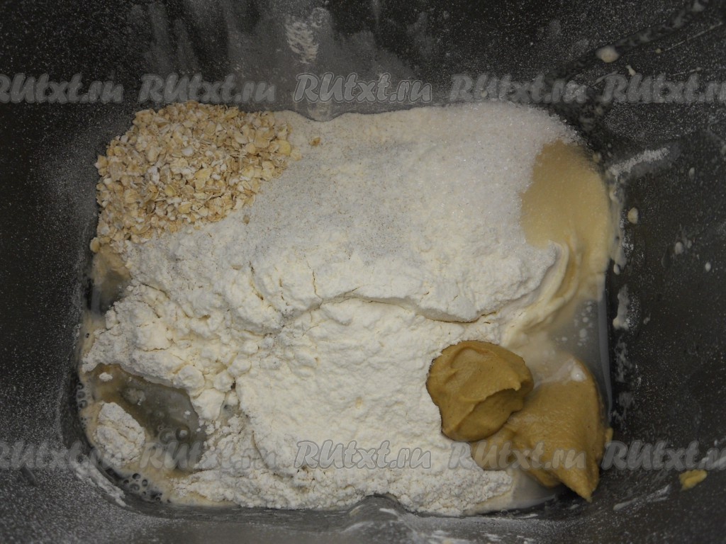 В ведерко хлебопечки влить теплую воду, всыпать просеянную смесь из муки. По углам разместить соль, сахар, овсяные хлопья, горчицу, влить растительное масло. Если по инструкции к вашей хлебопечке нужно загружать продукты в ином порядке - так и делайте!