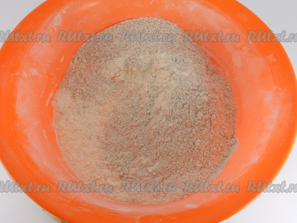 В миске смешать муку высшего сорта и ржаную муку.
