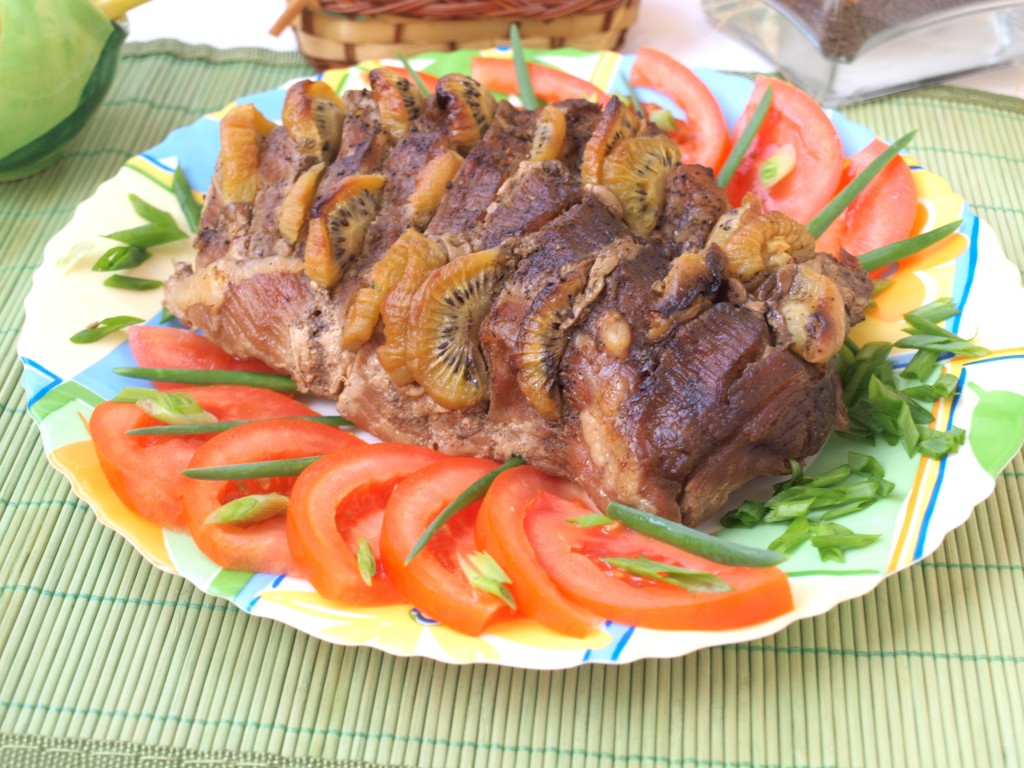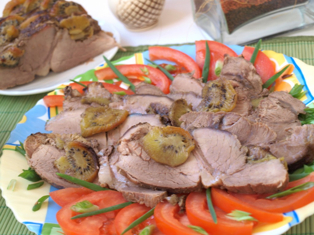 Свинину, запеченную с киви, достаём из духовки, вынимаем из пакета, даём остыть и нарезаем на порционные куски. Нежнейшее мясо можно подавать к столу.