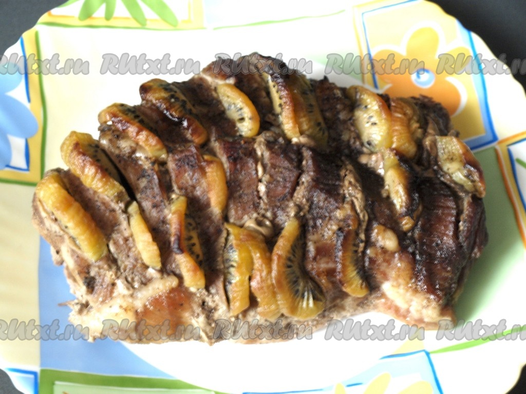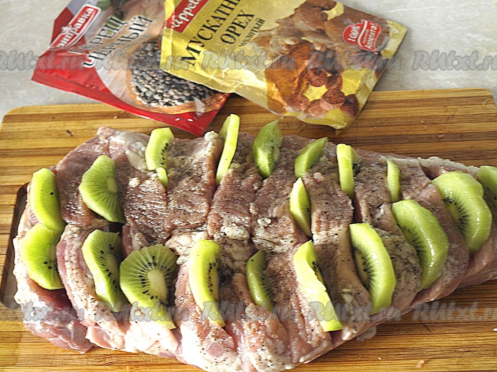 Свинину моем, обсушиваем. Делаем на мясе надрезы, солим, натираем перцем, мускатным орехом и растительным маслом. Очищенные от кожуры киви режем кружочками и вставляем в надрезы.
