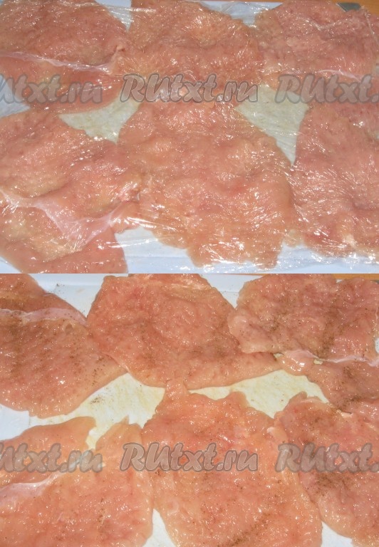 Филе курицы хорошо промыть, обсушить и разрезать на 2 части, каждую хорошо отбить, посолить, поперчить.