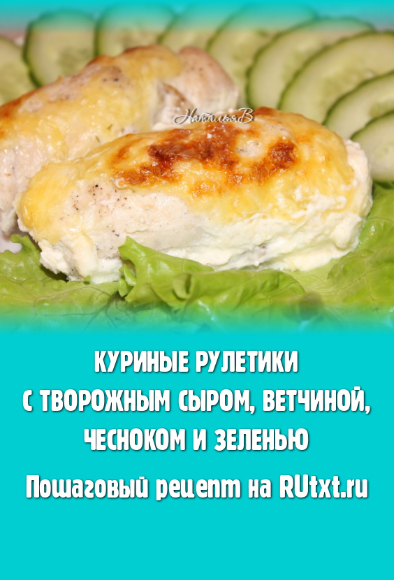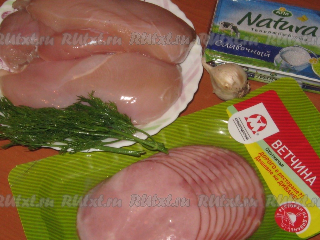 Аппетитные куриные рулетики с творожным сыром, ветчиной, чесноком и зеленью подавать с любым гарниром.