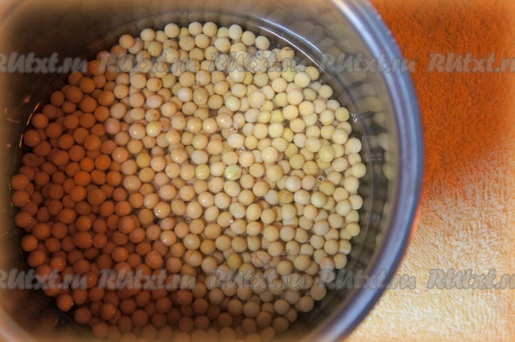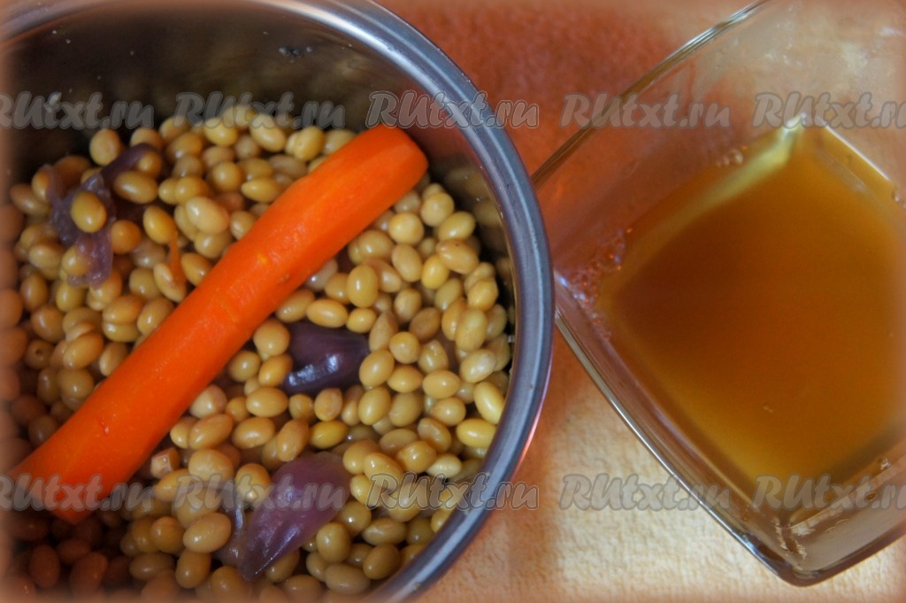 Соевые бобы тщательно промыть, залить водой, чтобы она покрывала бобы на 3-5 см. Оставить на 7-10 часов (удобнее на ночь).