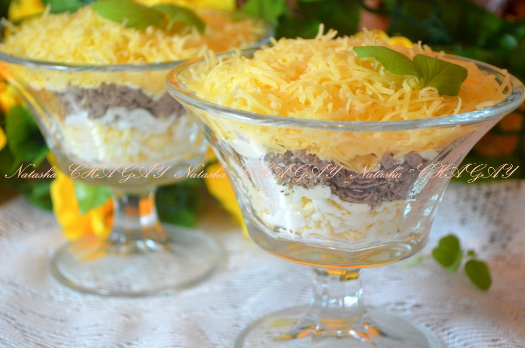 Украсить зеленью. Вкусный салат с печенью, сыром и яйцом готов.