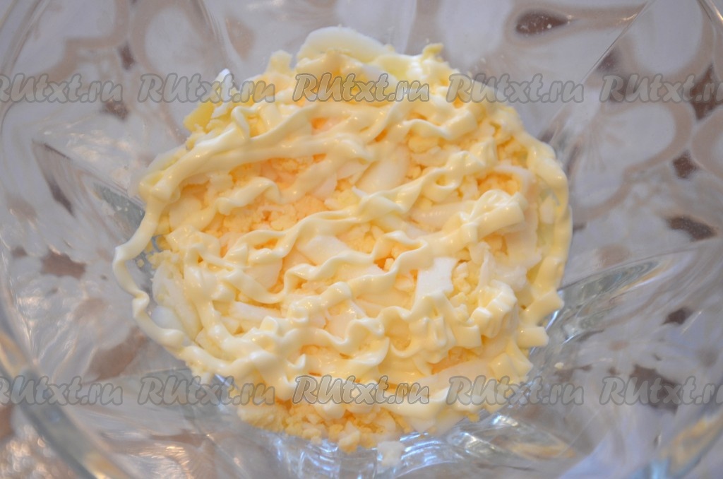 В салатник выложить первым слоем яйца. Посолить и поперчить по желанию, смазать сметаной или майонезом.