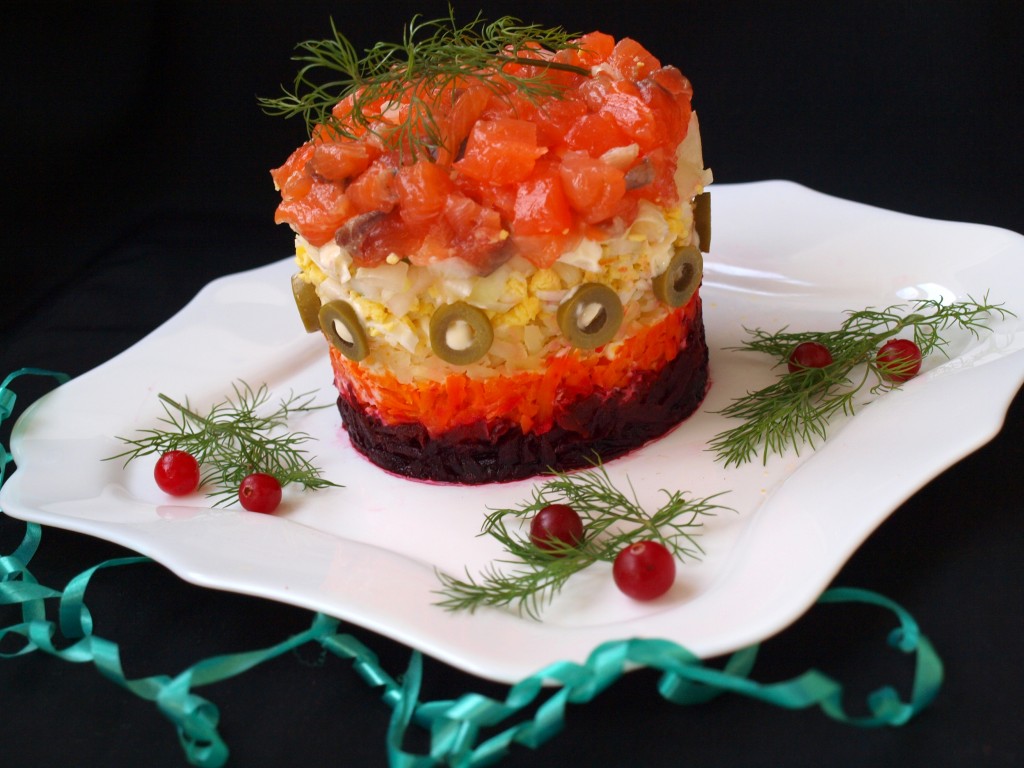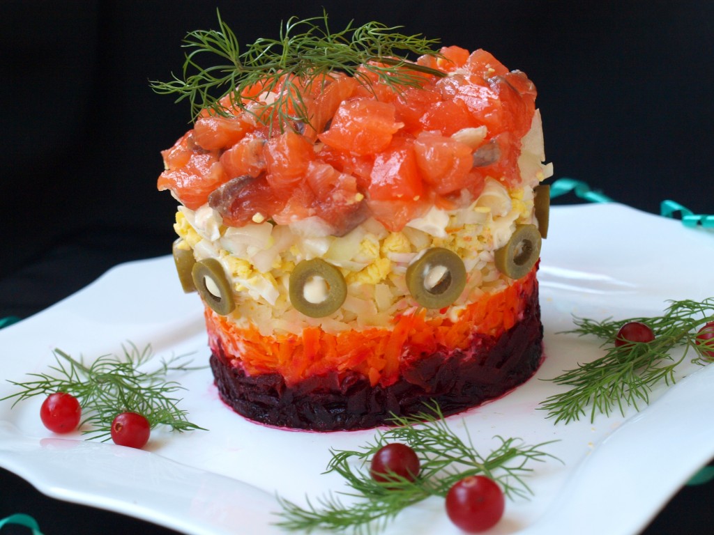 Украшаем вкусный, яркий салат "Королевская шуба" с сёмгой клюквой, оливками, зеленью и подаём к столу.