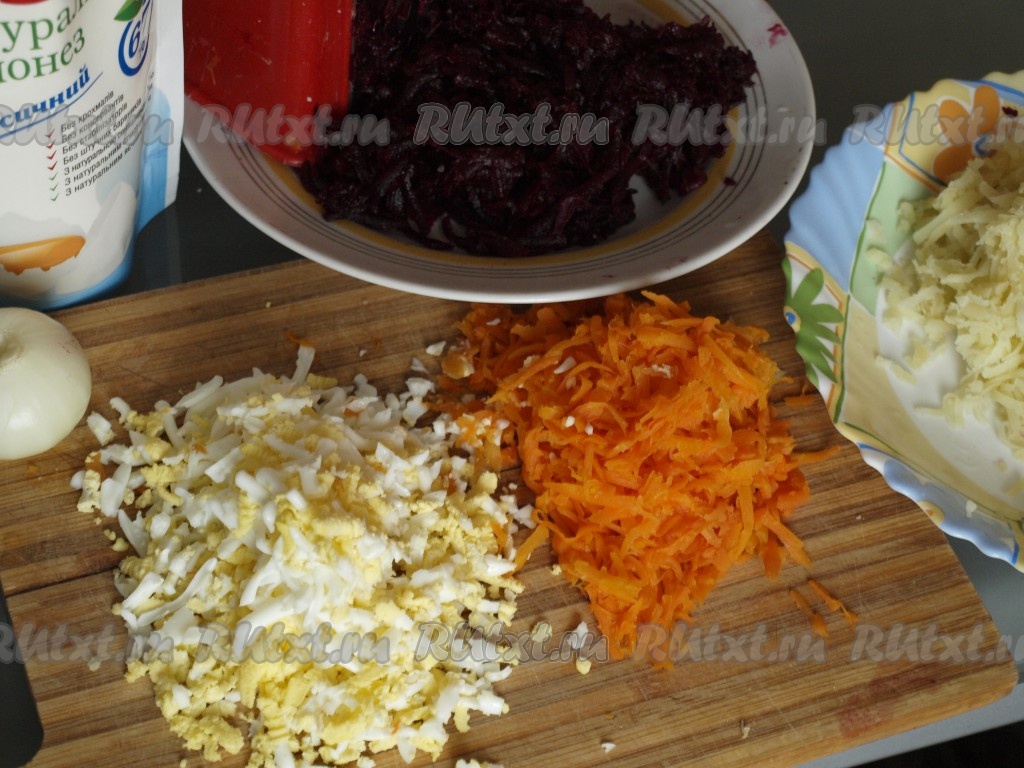 Сваренные картошку, морковку, свёклу, яйца очищаем и натираем их по отдельности на крупной тёрке. Лук режем кубиком, ошпариваем кипятком, чтобы удалить горечь, а затем сразу промываем холодной водой.