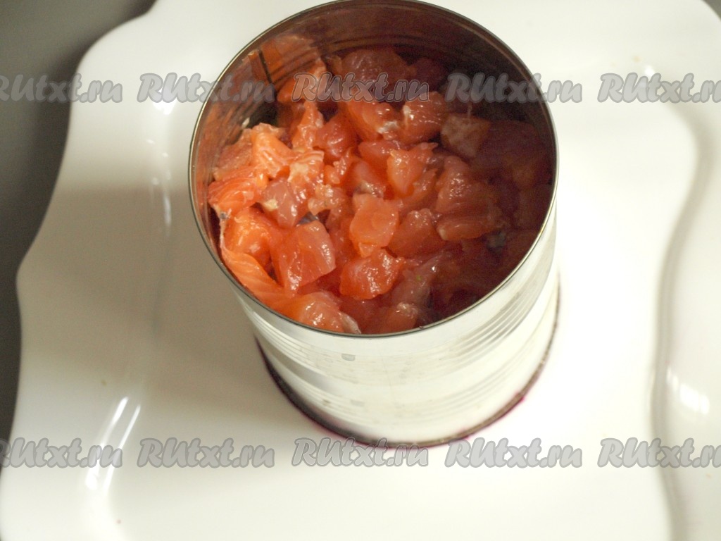Салат "Королевская шуба" выкладывается слоями. Для того чтобы блюдо выглядело более эффектно, воспользуемся формовочным кольцом. Его можно и купить, но я сделала кольцо для формовки из 850-граммовой банки из-под грибов, вырезав дно банки. Ставим формовочное кольцо в центр тарелки и выкладываем салат "Королевская шуба" слоями, немного промазывая каждый слой майонезом: 1 слой - свекла; 2 слой - морковь; 3 слой - картошка; 4 слой - яйца; 5 слой - лук; 6 слой - сёмга, порезанная кусочками (сёмга - единственный слой, который сверху не надо промазывать майонезом).