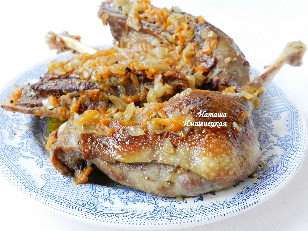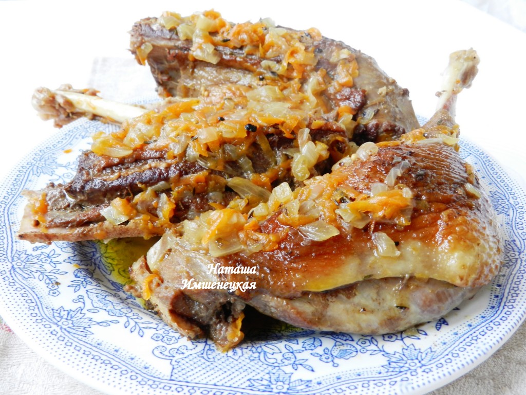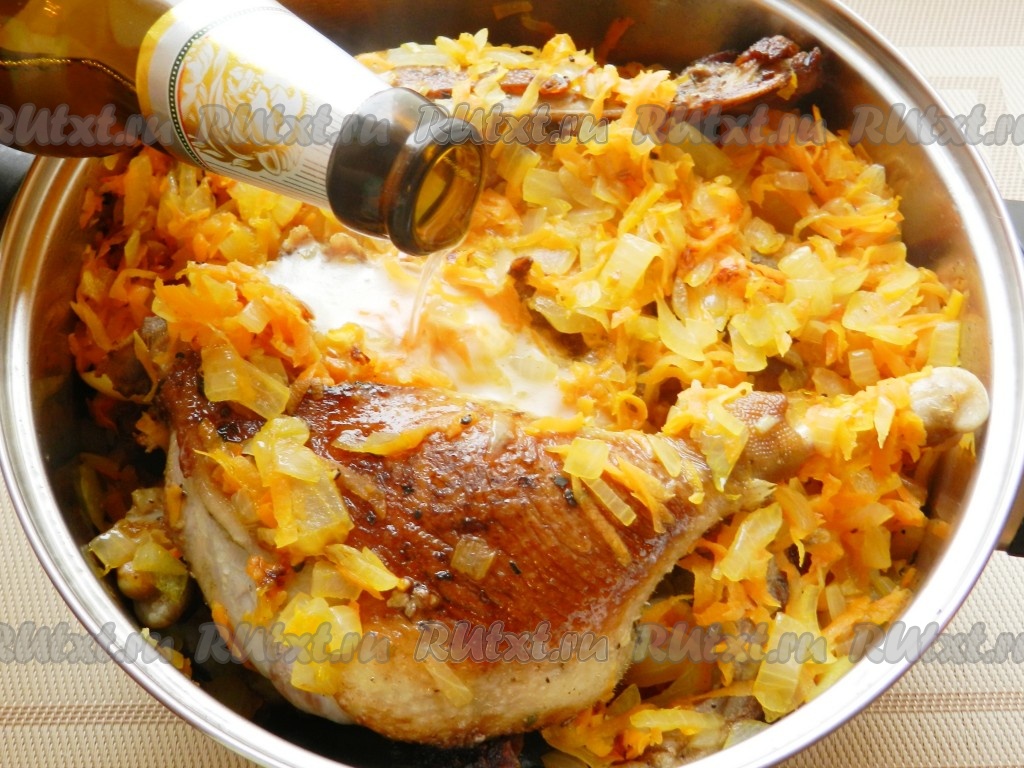 Вкусный и ароматный гусь, тушеный кусочками в пиве, готов.