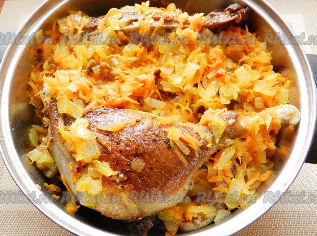 Переложить обжаренные лук и морковь в кастрюлю с мясом гуся.