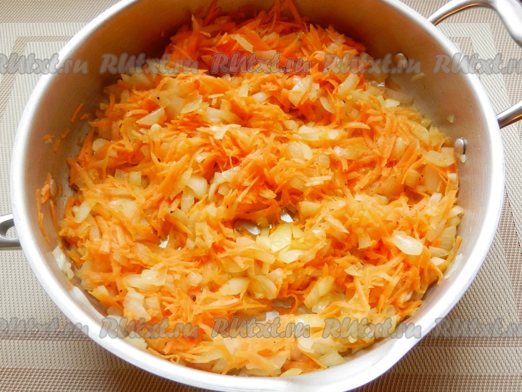 Лук и морковь обжарить отдельно, посолить, поперчить.