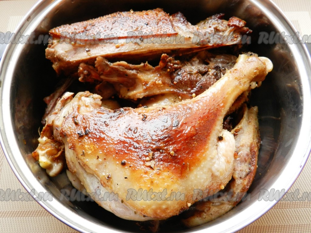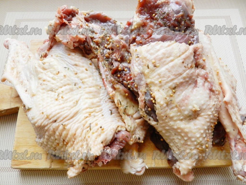 Для маринада смешать растительное масло, соль, горчицу, чеснок, пропущенный через пресс, черный молотый перец и травы. Этой смесью натереть каждый кусочек гуся, сложить в кастрюлю и убрать в холодильник на сутки.