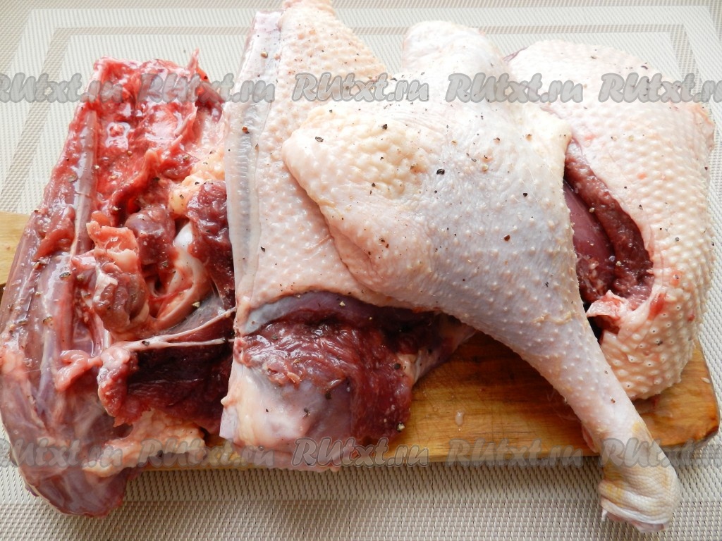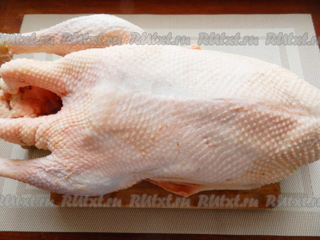Тушку гуся помыть, обсушить бумажными полотенцами. Если имеются остатки перьев - удалить их.
