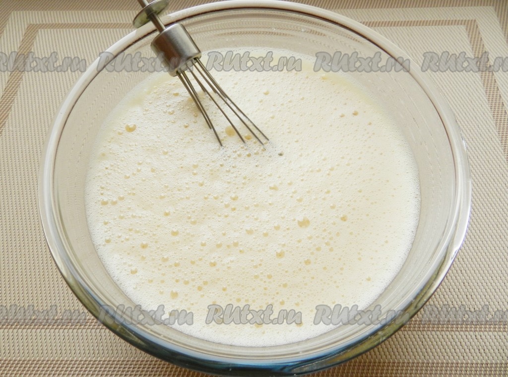 Взбить в пышную пену. Влить растительное масло и снова взбить.