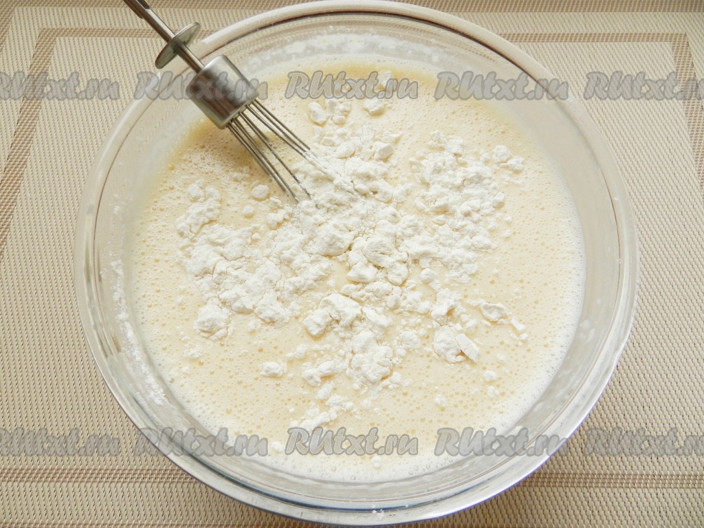 Постепенно всыпать муку с разрыхлителем. Муку добавлять по одной столовой ложке и сразу перемешивать, чтобы не было комков. Может быть, вам понадобится чуть больше или меньше муки, надо смотреть по консистенции теста. Чтобы блины на топленом молоке получились тонкими, тесто не должно быть густым.