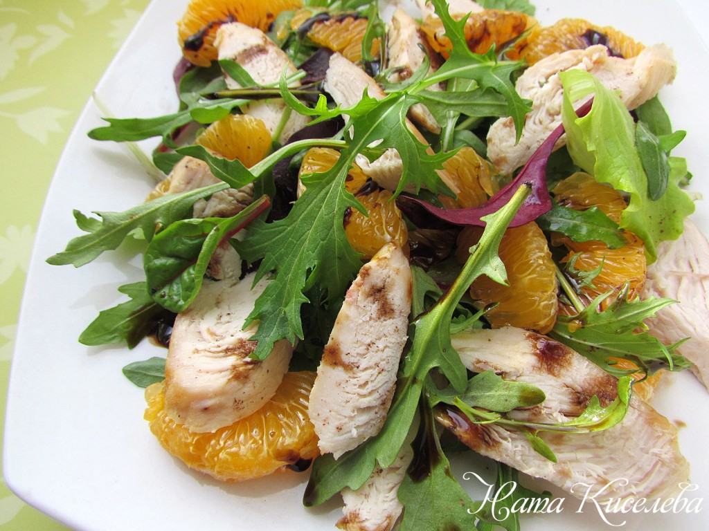 Сверху положите кусочки куриного мяса и мандариновые дольки. Полейте салат бальзамическим соусом и сразу же подавайте.