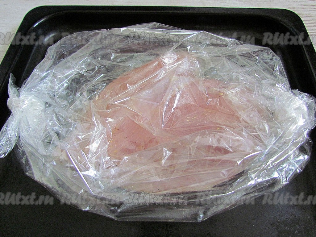 Переложите подготовленную куриное мясо в пакет для запекания. Плотно завяжите пакет с обеих сторон. Сверху сделайте несколько проколов. Запекайте филе около 30 минут в разогретой до 200 градусов духовке.
