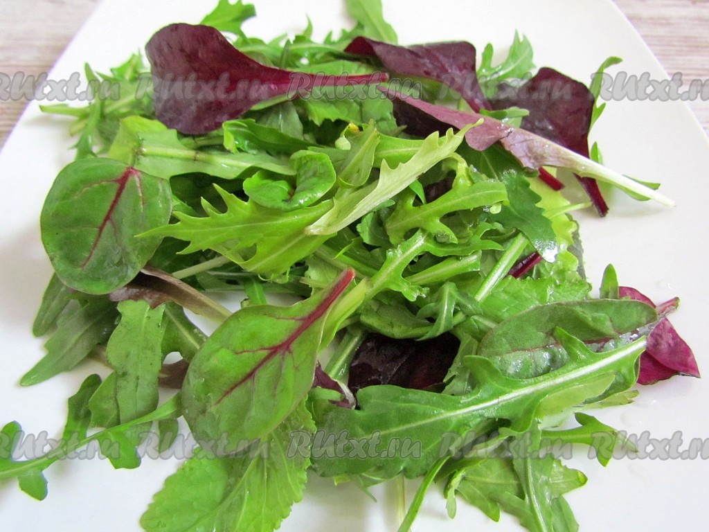 Салатные листья (у меня - руккола, латук, мангольд, шпинат) промойте, откиньте на дуршлаг и дайте воде стечь. Выложите листья на блюдо.