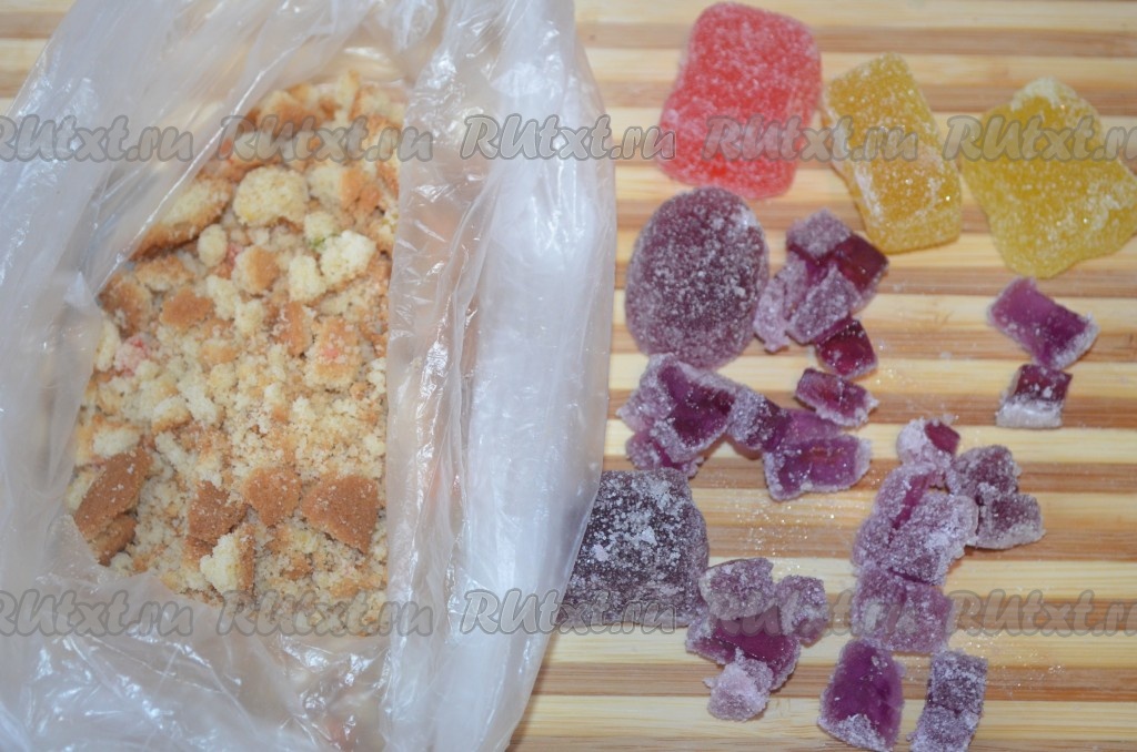 Печенье измельчить (не в пыль), мармелад нарезать маленькими кусочками.