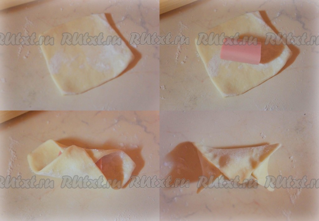 Возьмите один кусочек теста, раскатайте его до толщины 2-3 миллиметра, в середину положите кусочек сосиски, защипните сначала края по диагонали, затем защипните противоположные края. Получится конвертик из теста.
