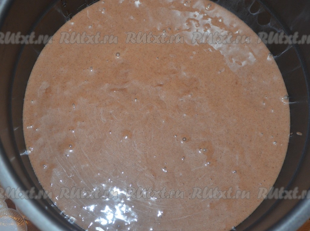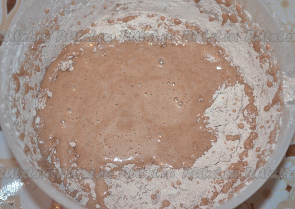 В получившуюся смесь просеять какао, разрыхлитель и часть муки, перемешать тесто миксером. Постепенно добавляя оставшуюся муку, продолжать перемешивать тесто. Добавляя муку, ориентируйтесь на консистенцию замешиваемого теста, которое должно получиться однородным, напоминающим в меру густую сметану.