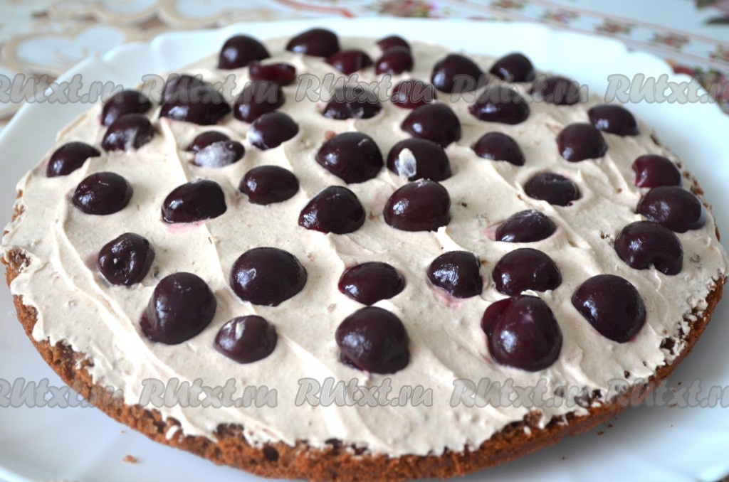 Промазать коржи любым кремом (например, сметанным кремом, для его приготовления просто нужно смешать сметану с сахаром), а затем можно на 2 коржа (кроме верхнего) выложить половинки любых ягод (у меня - черешня).