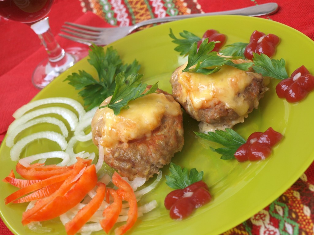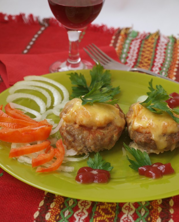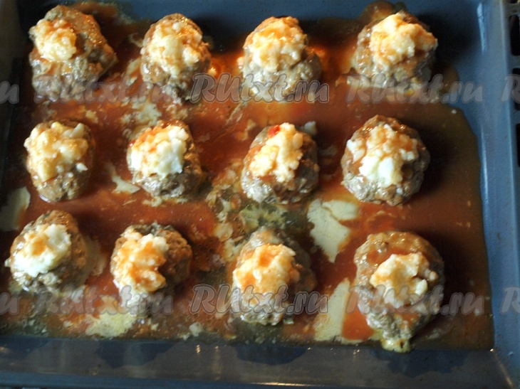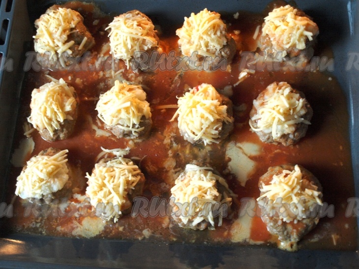 Каждую котлетку посыпаем натёртым сыром. Томатную пасту смешиваем с водой и полученным соусом (соус можно заменить и на томатный сок) поливаем котлеты и снова отправляем в духовку до зарумянивания.