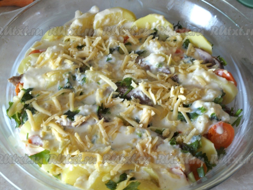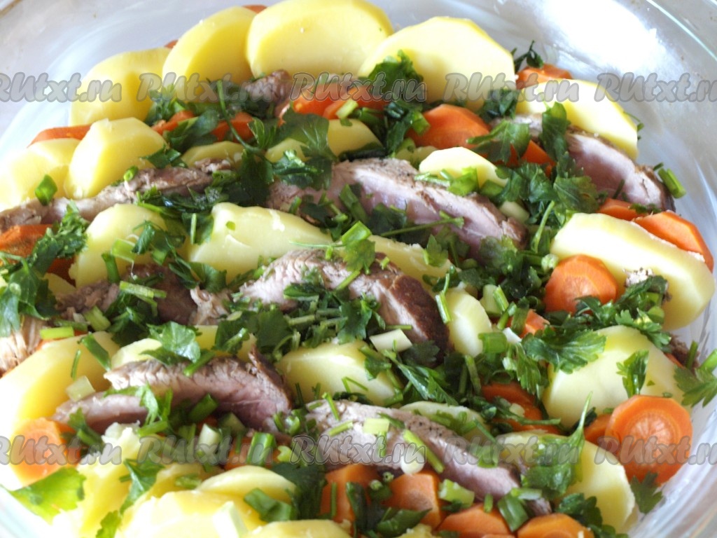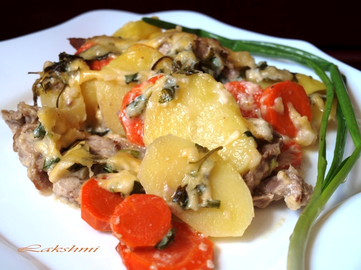 Смазываем сливочным маслом форму для запекания. Выкладываем вертикально слоями картофель, морковь и свинину. Сверху посыпаем порезанной петрушкой и зелёным луком.