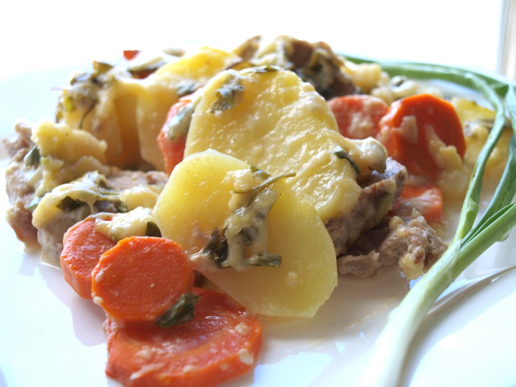 Гратен из картофеля с мясом и морковью получается не только сытным, но и очень вкусным.