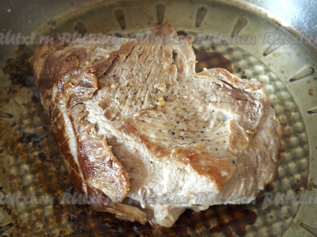 Целый кусок свинины, не разрезая на куски, моем, обсушиваем и обжариваем со всех сторон на сковороде на разогретом растительном масле до золотистой корочки. Солим и перчим по вкусу.