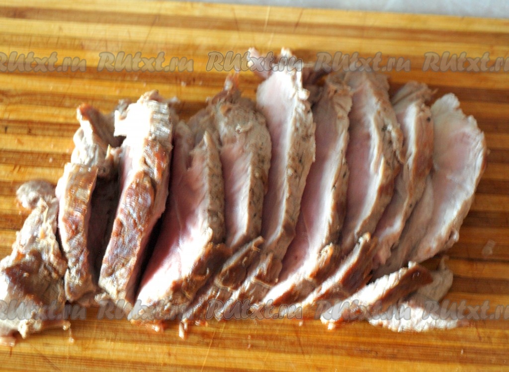 Затем даём мясу немного остыть и нарезаем кусочками толщиной примерно 3-4 мм.