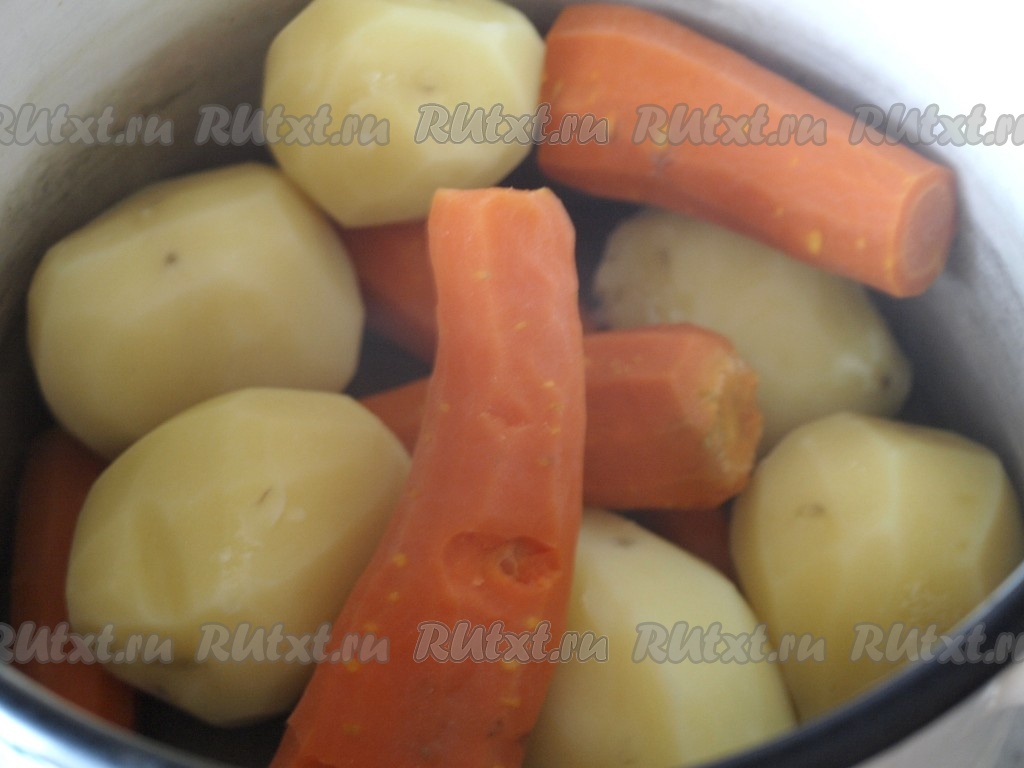 Картошку и морковь чистим, а потом отвариваем в подсоленной воде минут 15. Овощи вынимаем из воды и даём им немного остыть.