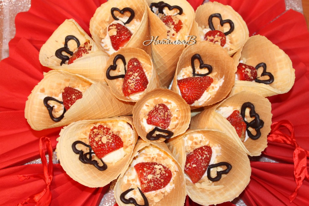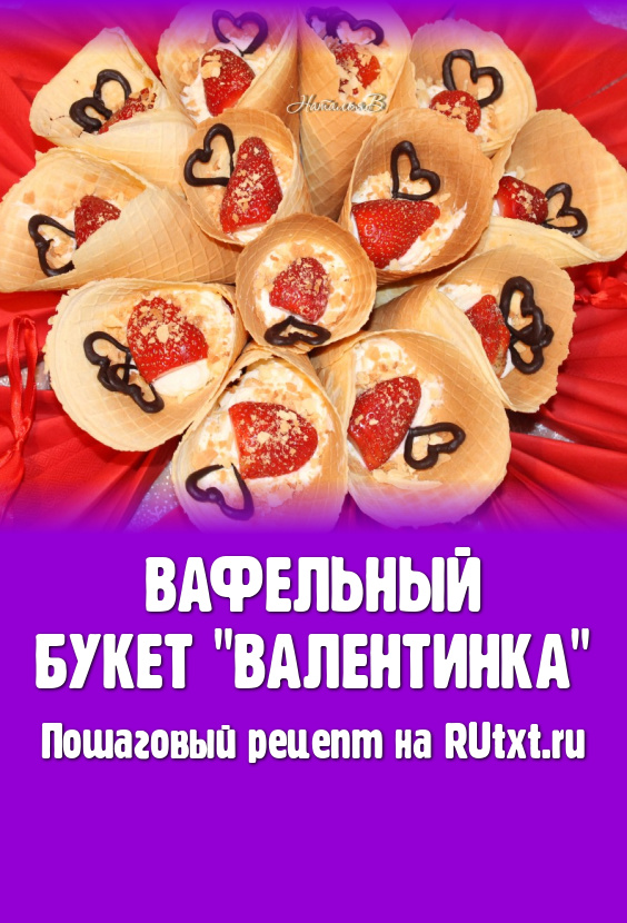 В каждый рожок положить по 1-2 шоколадных сердечка. Вкусный и красивый вафельный букет "Валентинка" готов!