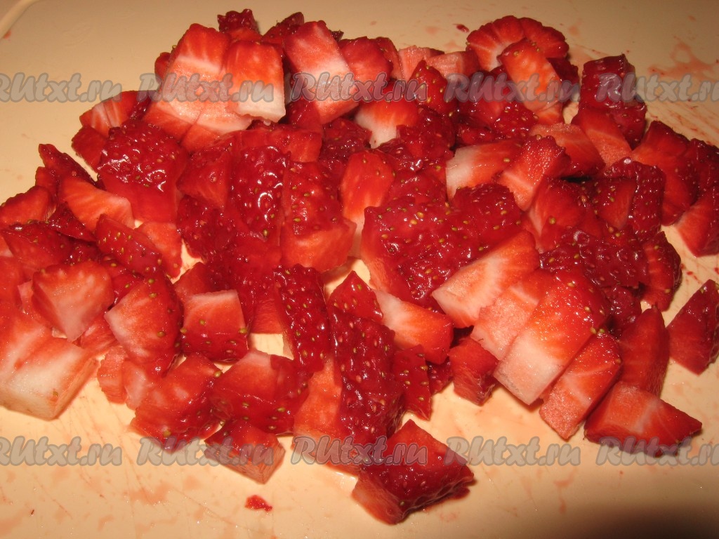 Половину клубники нарезать маленьким кубиком, другую половину разрезать пополам.