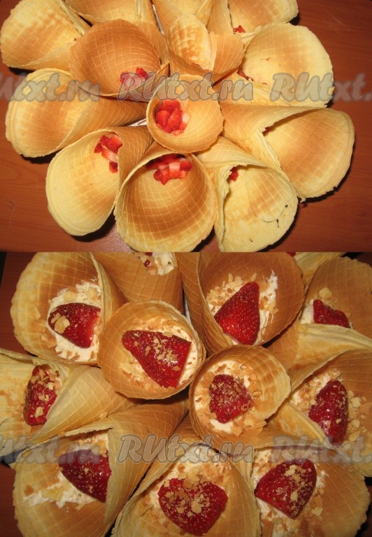 Вафельные рожки заполнить небольшим количеством нарезанной клубники, затем кремом, сверху украсить половинкой клубнички, можно посыпать вафельной крошкой.