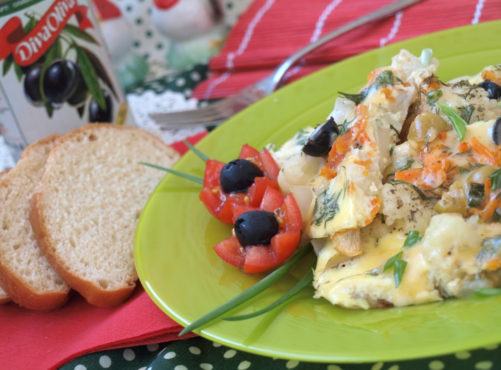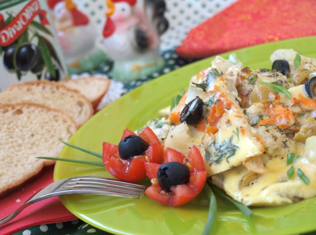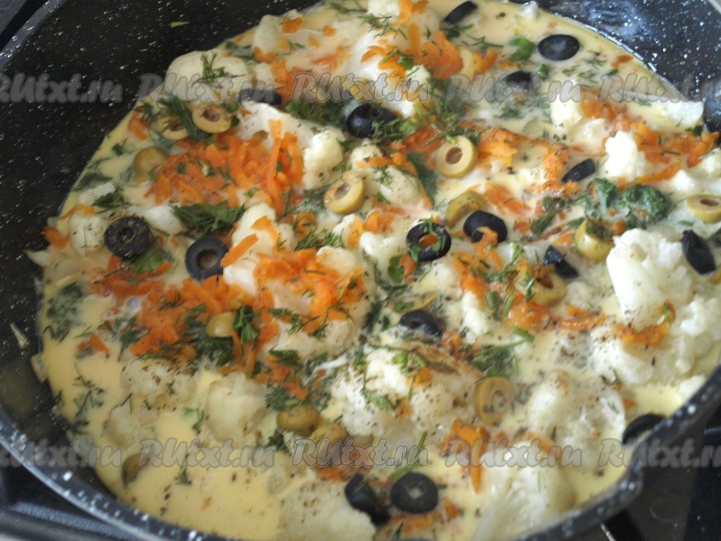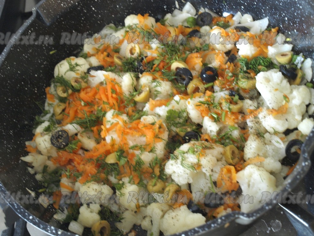 Обжариваем лук на сковороде с разогретым растительным маслом примерно 2-3 минуты на среднем огне, помешивая, затем добавляем морковку, перемешиваем. Жарим до мягкости морковки (минут 8-10), не забывая периодически овощи перемешивать. Затем добавляем в сковороду отваренную цветную капусту, оливки и укроп, солим и перчим по вкусу, перемешиваем.