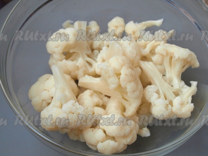 Цветную капусту разбираем на соцветия, перекладываем в кастрюлю, заливаем холодной водой, ставим на огонь, доводим воду до кипения, солим. Затем варим капусту на небольшом огне минут 5-6 (соцветия капусты должны легко прокалываться вилкой, но при этом они не должны быть переваренными). Затем откидываем на дуршлаг, чтобы стекла вода.