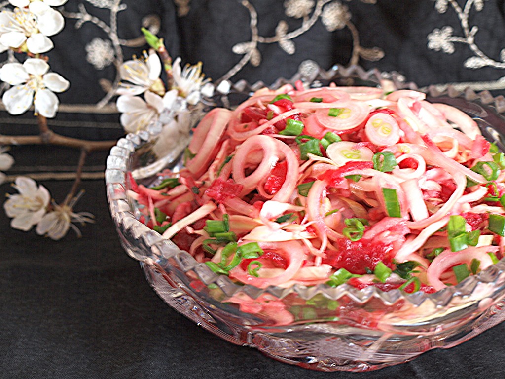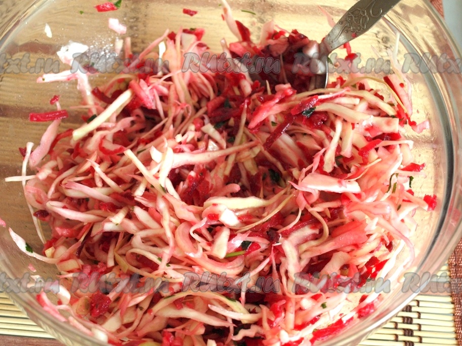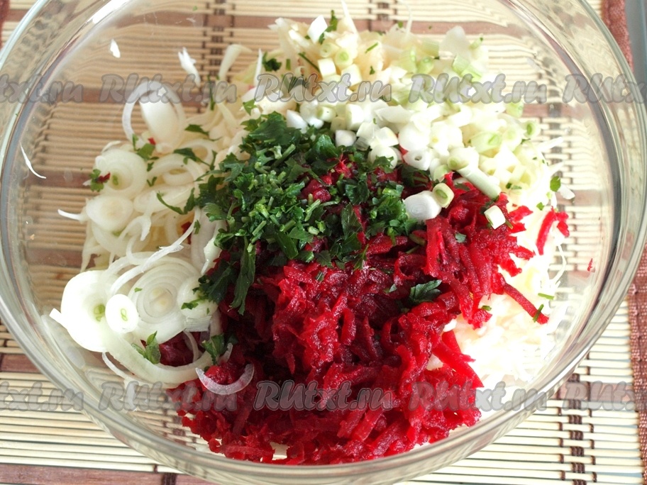 Зелёный лук и петрушку мелко рубим. Свеклу и яблоко (можно очистить от кожуры) трём на тёрке. Соединяем репчатый лук, порезанный кольцами, зелёный лук, петрушку, капусту, свеклу и яблоко.
