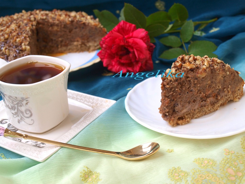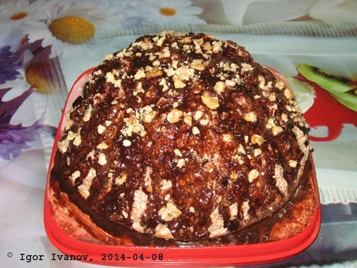 Оставшиеся грецкие орехи рубим на достаточно крупные кусочки. В оставшийся крем добавляем орехи (немного орехов оставьте для посыпки торта) и кусочки поломанного коржа, аккуратно перемешиваем и горкой выкладываем на основу торта.