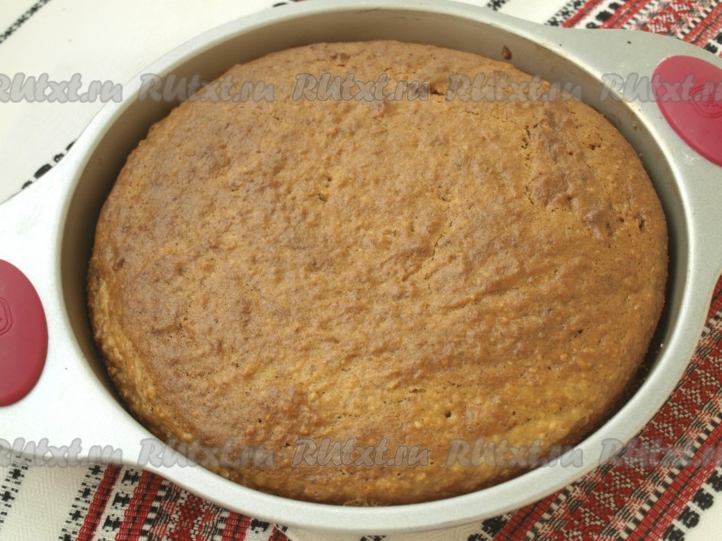 Форму для выпечки смазываем маслом, выкладываем тесто и готовим 30-35 минут в духовке, разогретой до 180 градусов. Достаём из духовки, даём остыть, а затем разрезаем на два коржа. Коржи надо сделать неравными по высоте: первый корж должен быть высотой примерно 1 сантиметр (он и станет основой торта), второй корж получится немного потолще (его нужно будет поломать на кусочки).